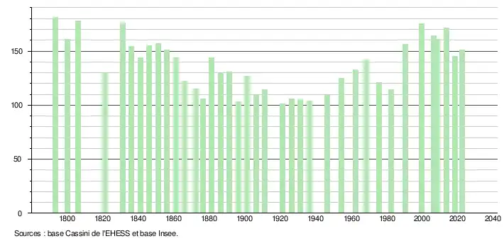 L'évolution du nombre d'habitants est connue à travers les recensements de la population effectués dans la commune depuis 1793. Pour les communes de moins de 10 000 habitants, une enquête de recensement portant sur toute la population est réalisée tous les cinq ans, les populations de référence des années intermédiaires étant quant à elles estimées par interpolation ou extrapolation[23]. Pour la commune, le premier recensement exhaustif entrant dans le cadre du nouveau dispositif a été réalisé en 2008[24].
