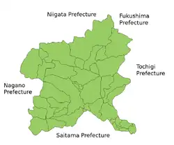 Au nord se trouvent les préfectures de Niigata et de Fukushima, à l'est la préfecture de Tochigi, au sud celle de Saitama et à l'ouest celle de Nagano.