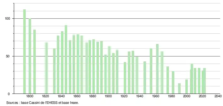 L'évolution du nombre d'habitants est connue à travers les recensements de la population effectués dans la commune depuis 1793. Pour les communes de moins de 10 000 habitants, une enquête de recensement portant sur toute la population est réalisée tous les cinq ans, les populations de référence des années intermédiaires étant quant à elles estimées par interpolation ou extrapolation[26]. Pour la commune, le premier recensement exhaustif entrant dans le cadre du nouveau dispositif a été réalisé en 2005[27].