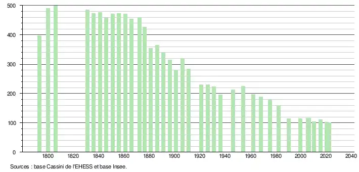 L'évolution du nombre d'habitants est connue à travers les recensements de la population effectués dans la commune depuis 1793. Pour les communes de moins de 10 000 habitants, une enquête de recensement portant sur toute la population est réalisée tous les cinq ans, les populations de référence des années intermédiaires étant quant à elles estimées par interpolation ou extrapolation[21]. Pour la commune, le premier recensement exhaustif entrant dans le cadre du nouveau dispositif a été réalisé en 2005[22].