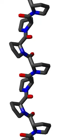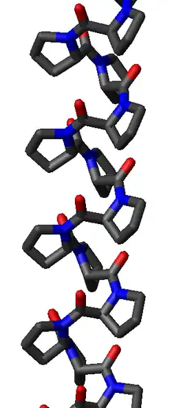 Une hélice polyproline est un type de structure secondaire de certaines protéines présentant une répétition de résidus de proline[1]. Il se forme une hélice polyproline gauche dite de type II, notée PPII, lorsque l'ossature de la suite de résidus présente des angles dièdres (φ, ψ) d'environ (–75°, 150°) et des liaisons peptidiques en configuration trans. Cette conformation PPII se rencontre également dans des polypeptides et des protéines en dehors des hélices polyproline. Il existe également une hélice polyproline droite plus compacte dite de type I, notée PPI, dans laquelle l'ossature de la suite de résidus de proline présente des angles dièdres (φ, ψ) d'environ (–75°, 160°) et des liaisons peptidiques en configuration cis. Parmi les 20 acides aminés rencontrés couramment dans les protéines, seule la proline est susceptible d'avoir une liaison peptidique en configuration cis, notamment la liaison X–Pro ; des effets stériques et effets électroniques favorisent nettement la configuration trans de la plupart des liaisons peptidiques. Cependant, les liaisons peptidiques qui remplacent la proline avec un autre acide aminé N-substitué comme la sarcosine sont également susceptibles d'adopter une configuration cis.