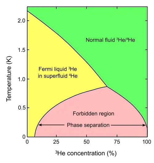 Les deux isotopes de l'hélium ne sont pas complètement miscibles à des températures inférieures à −272,25 °C à leur pression de vapeur saturante. Sous cette température, un mélange de ces deux isotopes subit une séparation de phase où un fluide normal (riche en hélium 3) flotte sur une phase superfluide plus dense (riche en hélium 4). À très basses températures, la phase superfluide peut contenir jusqu'à 6 % d'hélium 3 en solution, ce qui permet de créer un réfrigérateur à dilution capable d'atteindre des températures de l'ordre de 2 mK[8].