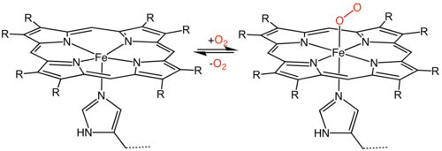 Le résidu His-F8 de la myoglobine, également connu sous le terme d'histidine proximale, est lié de façon covalente à la cinquième position de coordination du fer. L'oxygène interagit avec l'hisitine distale via une liaison hydrogène et non une liaison covalente. Il se lie à la sixième position de coordination du fer, et le résidu His-E7 de la myoglobine se lie à l'oxygène qui est maintenant lié de façon covalente au fer. C'est la même chose pour l'hémoglobine ; cependant, comme celle-ci possède quatre sous-unités, elle contient quatre groupes hème au total, ce qui permet à quatre molécules de dioxygène de se lier à la protéine.