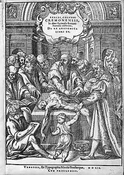 Après la longue période de stagnation des connaissances qui suivit l’œuvre de Galien, les premières percées de la description anatomique se font à l'université de Padoue (nord de Venise) qui s'était déjà fait remarquer par son esprit frondeur et sa contestation de l'orthodoxie aristotélicienne. Le médecin brabançon André Vésale, peut s'y livrer librement à une intense activité de dissection de corps humains[16]. En 1542, il publie De humani corpori fabrica libri septem, un ouvrage décrivant dans le détail chaque partie du corps et comportant plus de 300 illustrations, la plupart probablement réalisées par des peintres professionnels de l'école du Titien. Sur plus de 200 points, il s'écarte de l'orthodoxie galénique, ce qui va déclencher la fureur des gardiens de la tradition, comme celle de son ancien maître Sylvius de Paris. Sa contribution à l'anatomie du cerveau, du foie, des voies biliaires est fondamentale.