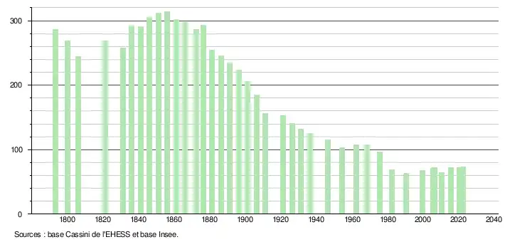 L'évolution du nombre d'habitants est connue à travers les recensements de la population effectués dans la commune depuis 1793. Pour les communes de moins de 10 000 habitants, une enquête de recensement portant sur toute la population est réalisée tous les cinq ans, les populations de référence des années intermédiaires étant quant à elles estimées par interpolation ou extrapolation[14]. Pour la commune, le premier recensement exhaustif entrant dans le cadre du nouveau dispositif a été réalisé en 2005[15].