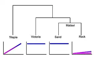 Les acides aminés formant les protéines d’opsine déterminent le spectre de lumière qui peut être absorbé par le pigment visuel qu’elles composent. Les espèces étudiées ont les mêmes 7 gènes de cônes d’opsine, mais la différence entre les espèces dans le temps et la durée d’expression de chaque gène serait indicatrice d’un changement hétérochronique. Une espèce de Tilapia (Oreochromis niloticus), un cichlidé riverain, est utilisée comme exogroupe (outgroup), donc comme espèce de référence, aux espèces du Lac Malawi pour comparer leurs développements des patrons d’expression des opsines et ainsi voir quels changements sont survenus depuis le dernier ancêtre commun.