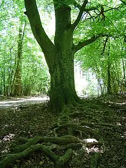 Le système racinaire du hêtre est à la base un système « en cœur »[39] puissant, avec de nombreuses racines multidirectionnelles et souvent soudées entre elles, qui en l'absence de contraintes peut s'installer assez profondément. Cet enracinement n'est cependant pas capable de franchir des obstacles du sol tels que des couches compactes et mal drainées ou des couches indurées. Les racines tendent alors par compensation à se développer horizontalement en surface et confèrent alors au hêtre sa réputation d'arbre à enracinement superficiel. Une telle assise de l'arbre en « galette » peut alors le rendre plus sensible au renversement par le vent que s'il s'agissait d'une autre essence forestière. L'espèce peut néanmoins y trouver un avantage concurrentiel sur certains types de sols, notamment sur dalle rocheuse, car la surface racinaire étendue augmente la capacité de captation de l'eau[40].