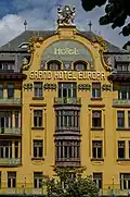 Il est constitué de deux parties, l'une dont la façade donne sur la place Venceslas, l'autre perpendiculaire sur cour. La décoration sculpturale est le résultat du travail de Ladislav Šaloun[1]. La façade symétrique de l'hôtel sur la grand place affiche une décoration Art nouveau de grande qualité. Le riche encadrement aux motifs végétaux possède un haut bouclier en forme de demi-cercle. À son sommet, une sculpture dorée portant une lampe en forme de globe représente le symbole de l'Europe[1]. L'hôtel est alors nommé « U Archivévody Štěpána » (Chez l'Archiduc Stephan)[2].