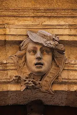 La porte, richement sculptée, est d'origine. Elle est surmontée d'un mascaron à tête de bergère. L'encadrement est à pilastres dédoublés, surmontés de chapiteaux corinthiens[3].