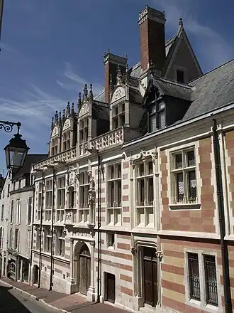 De la façade d'origine, seuls sont conservés l'encadrement et le décor des fenêtres du rez-de-chaussée ainsi que le portail monumental. Le mur et les fenêtres rappellent en tous points le style gothique du palais de Louis XII. On y retrouve les lits horizontaux de briques rouges et de tuffeau blanc mais aussi les culots sculptés de petits personnages grotesques (anges, enfants, homme sauvage, centaure, etc.). Ces héritages du Moyen Âge coexistent avec des éléments beaucoup plus modernes, comme le portail avec ses pilastres cannelés et ses chapiteaux ornés de dauphins et de volutes[4],[18].