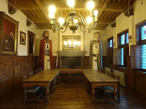 Le premier étage abrite une vaste salle créée par l'architecte Jules Charbonnelle en lieu et place de trois pièces. C'est ici que se sont tenus les mariages et les réunions du conseil communal. Aujourd'hui, elle est surnommée Salle du Grand Bailli. Son décor comporte deux cheminées Renaissance, celle à gauche de l'entrée est d'origine tandis que celle qui lui fait face en est sa copie fidèle. Leurs briques fonds représentent les profils de l'archiduc Albert et de son épouse l'archiduchesse Isabelle. Les taques de cheminée montrent les armoiries des Rois de France avec les lys et l'autre les initiales de l'empereur Charles Quint. Quant au plafond, celui d'origine a été remplacé après l'incendie de 1914 par une structure en béton armé avec une peinture imitant le bois. Sur les murs plusieurs peintures et gravures montrent des anciens bourgmestres de Braine-le-Comte : Joseph Martel, Aimé Oblin, Félicien Étienne, René Brancart, Henri Neuman et Jean-Baptiste Cornet. Et aussi des personnalités de la ville : Henri-Joseph Rey, Adolphe Gillis, le duc d'Arenberg et Émile Heuchon. Enfin, les sept fenêtres de la salle comportent des vitraux représentant les différents sigles, armoiries et sceaux en lien avec Braine-le-Comte.