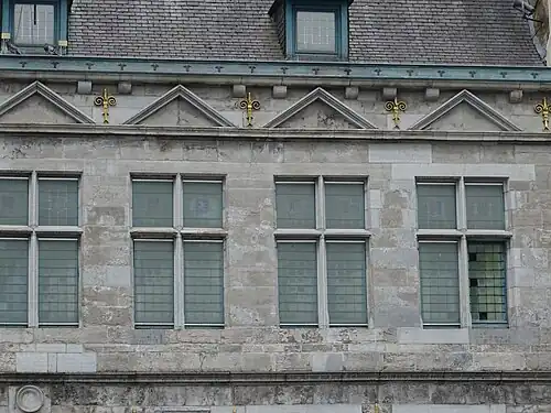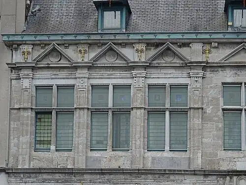L'étage montre sept fenêtres à meneaux surmontés de frontons triangulaires, celles de la partie gauche, qui est la plus ancienne, sont séparés par quatre trumeaux plats à ornements variés, surmontés de chapiteaux sur lesquelles reposent les frontons. Des pilastres à panneaux partent du cordon de l'étage pour aboutir sous la corniche en pierre. Celle-ci est soutenue par des corbeaux moulurés du côté droit, le mieux décoré, et tout à fait unis du côté gauche.