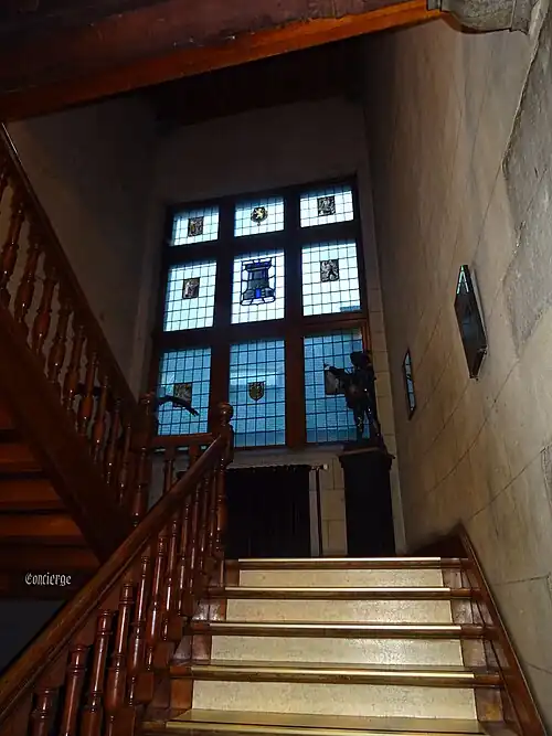 Le palier de l'escalier est éclairé par une large baie vitrée dont les médaillons représentent des corps de métiers et des blasons : le menuisier, le blason de la Belgique, le papetier, l'imprimeur, le blason de Braine-le-Comte, le semeur, le forgeron, les armes du Hainaut et le souffleur de verre.