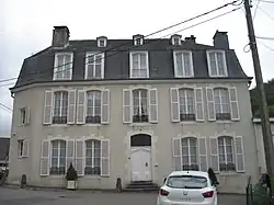 La façade avant compte cinq travées en double corps et trois niveaux (deux étages) dont le dernier est légèrement mansardé et bardé d'ardoises. Elle se caractérise aux deux premiers niveaux par des baies vitrées avec montants harpés surmontées par des linteaux bombés en claveaux passants un sur deux et précédées par des garde-corps en fer forgé et complétées par des volets ajourés. La porte d'entrée surmontée d'une imposte ornée de ferronnerie est accessible par trois marches en pierre calcaire.