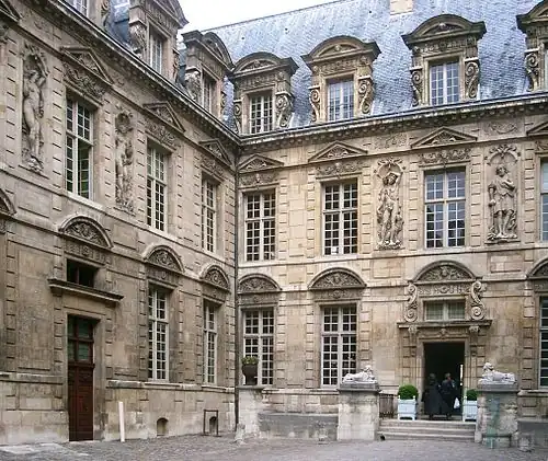- ↑ Hôtel ne disposant pas de la place suffisante, les fonctions de remises et d'écurie se mêlent dans la cour unique, les premières dans une suite d'arcades, la seconde côté rue. Les grandes demeures disposent en plus de la cour d'honneur d'une cour de service avec notamment des bâtiments abritant les écuries dont le nombre de stalle est un étalon de la richesse et de l'importance du propriétaire. « Il peut y avoir une écurie à deux rangées de stalles, disposition que Savot (la) critique, mais qui domine. À partir du XVIIe siècle, l'écurie se complète de remises à carrosses, pour ranger les voitures, encombrantes et trop fragiles pour être laissées dehors. Ces remises peuvent rester ouvertes sur la cour ou bien être fermées de portes de menuiserie. Elles deviendront logiquement, au XXe siècle, les garages des automobiles ». Cf. Alexandre Gady, Les hôtels particuliers de Paris : du Moyen-Âge à la Belle Époque, Parigramme, , p. 65.