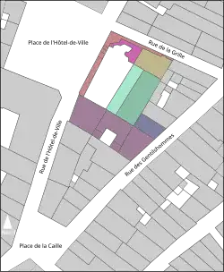 - l'enceinte côté place de l’Hôtel de Ville et la tour[25] ;