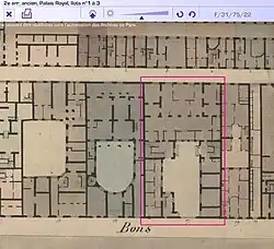Sur le plan de l’hôtel au cadastre de Vasserot, vers 1810 (Planche F/31/75/22, dite 2e arrondissement ancien, Palais Royal, îlots no 1 à 3.) se découvre le plan et l’aménagement intérieur de l’hôtel, alors au numéro 17 de la rue des Bons Enfans. On distingue clairement la cour d’entrée, qui n’a rien de spectaculaire. L’aile Nord de la cour d’entrée est constituée de quatre remises, qui ont certainement servies du temps des « écuries de Monsieur ». Surtout, le plan, assez précis, nous donne l’agencement de l’hôtel du côté du jardin. L’ensemble était constitué d’un corps de logis principal, flanqué de deux petites ailes en retour, toujours visibles sur le plan, malgré l’ajout de constructions postérieures au cours du XVIIIe siècle, bouchant la cour du côté du jardin. Cette disposition concorde parfaitement avec la vue de Turgot, où l’on découvre nettement la cour de l’hôtel côté jardin. Deux fenêtres éclairaient les façades des deux petits pavillons du côté du parterre, tandis que le fond de la cour disposait de cinq baies. Chacun des pavillons latéraux disposait en outre de trois baies de manière latérale. Ces fenêtres ont été modifiées sur le plan de Vasserot.