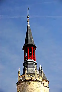 En 1878, on décida de surélever le toit de la tour nord par l'ajout d'un beffroi avec campanile[PC 1] et cela malgré le fait que rien ne puisse attester l’existence d'un tel élément dans l'histoire du monument. Dans l'histoire de la ville, le premier beffroi « communal » était situé au sommet de la porte de Mallevault, puis il fut transféré au sommet de la porte de la Grosse Horloge en 1478.