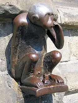 À gauche du portail d'entrée se trouve une petite statue en fer forgé représentant un singe. Elle remonte à plusieurs siècles. Son origine repose sur trois hypothèses : le chef-d'œuvre d'un forgeron ayant voulu affirmer la maîtrise de son art ; un pilori pour enfants turbulents ; l'enseigne d'une taverne qui se trouvait dans les caves de l'Hôtel de Ville, L'estaminet de la Grand place.