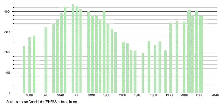 L'évolution du nombre d'habitants est connue à travers les recensements de la population effectués dans la commune depuis 1793. Pour les communes de moins de 10 000 habitants, une enquête de recensement portant sur toute la population est réalisée tous les cinq ans, les populations de référence des années intermédiaires étant quant à elles estimées par interpolation ou extrapolation[24]. Pour la commune, le premier recensement exhaustif entrant dans le cadre du nouveau dispositif a été réalisé en 2005[25].