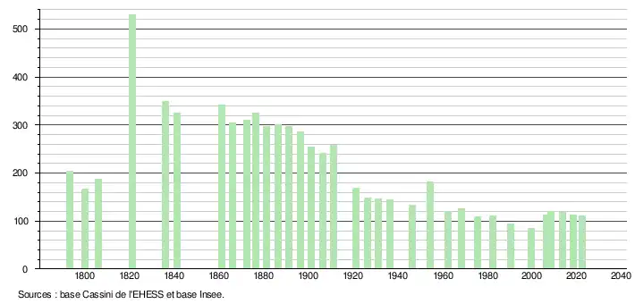 L'évolution du nombre d'habitants est connue à travers les recensements de la population effectués dans la commune depuis 1793. Pour les communes de moins de 10 000 habitants, une enquête de recensement portant sur toute la population est réalisée tous les cinq ans, les populations de référence des années intermédiaires étant quant à elles estimées par interpolation ou extrapolation[18]. Pour la commune, le premier recensement exhaustif entrant dans le cadre du nouveau dispositif a été réalisé en 2008[19].