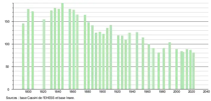 - ↑ Population municipale de référence en vigueur au 1er janvier 2025, millésimée 2022, définie dans les limites territoriales en vigueur au 1er janvier 2024, date de référence statistique : 1er janvier 2022.