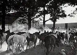 On pouvait admirer devant la maison du grand maître des écuries avant 1914 une statue en bronze du cheval Morgenstrahl sculptée par Reinhold Kuebart (de) qui fut dérobée par les armées impériales russes et envoyée à Moscou. Elle fut remplacée par la statue d’un Loup (venant du haras de Ribarty), elle-même remplacée en 1932 par un autre cheval, Tempelhüter[3], sculpté par le même Kuebart. Les étalons, les yearlings, les poulains, les juments, les poulinières, etc. étaient dans des écuries séparées avec des prés séparés. Les poulinières étaient réparties par couleur : alezan, bai fondé, noir et un troupeau mélangé. Les vingt étalons reproducteurs principaux étaient installés chacun dans son paddock particulier dans un pavillon individuel, avec son propre pré qui était attenant[4] et était traité comme un individu avec un arbre généalogique remontant loin dans le passé.