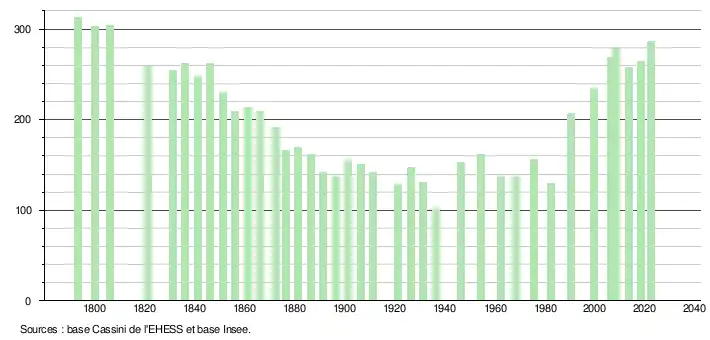 L'évolution du nombre d'habitants est connue à travers les recensements de la population effectués dans la commune depuis 1793. Pour les communes de moins de 10 000 habitants, une enquête de recensement portant sur toute la population est réalisée tous les cinq ans, les populations de référence des années intermédiaires étant quant à elles estimées par interpolation ou extrapolation[22]. Pour la commune, le premier recensement exhaustif entrant dans le cadre du nouveau dispositif a été réalisé en 2008[23].