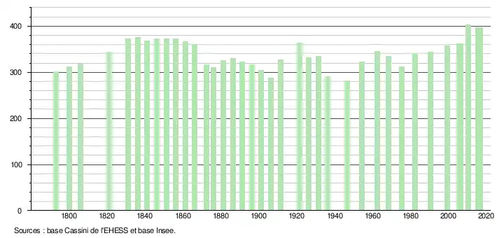 L'évolution du nombre d'habitants est connue à travers les recensements de la population effectués dans la commune depuis 1793. Pour les communes de moins de 10 000 habitants, une enquête de recensement portant sur toute la population est réalisée tous les cinq ans, les populations de référence des années intermédiaires étant quant à elles estimées par interpolation ou extrapolation[13]. Pour la commune, le premier recensement exhaustif entrant dans le cadre du nouveau dispositif a été réalisé en 2005[14].