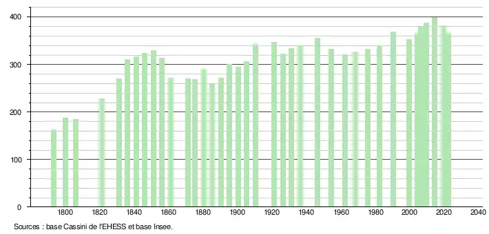 L'évolution du nombre d'habitants est connue à travers les recensements de la population effectués dans la commune depuis 1793. Pour les communes de moins de 10 000 habitants, une enquête de recensement portant sur toute la population est réalisée tous les cinq ans, les populations de référence des années intermédiaires étant quant à elles estimées par interpolation ou extrapolation[13]. Pour la commune, le premier recensement exhaustif entrant dans le cadre du nouveau dispositif a été réalisé en 2004[14].