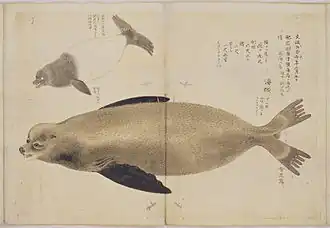 Dessin d'un phoque échoué sur une plage près de Karatsu, par Hasegawa Settan