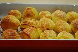 Les hasselbackspotatis (en suédois : pommes de terre Hasselback, ou pommes de terre à la Hasselbacken) sont une recette de pommes de terre cuites, où les pommes de terre sont coupées en tranches minces environ jusqu'à la moitié (on peut s'aider d'un manche de cuiller en bois pour éviter de couper jusqu'au bout). Du beurre, de la chapelure et des amandes sont ajoutés sur le dessus des pommes de terre lors de la cuisson[1].