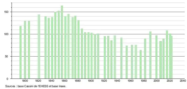 L'évolution du nombre d'habitants est connue à travers les recensements de la population effectués dans la commune depuis 1793. Pour les communes de moins de 10 000 habitants, une enquête de recensement portant sur toute la population est réalisée tous les cinq ans, les populations de référence des années intermédiaires étant quant à elles estimées par interpolation ou extrapolation[26]. Pour la commune, le premier recensement exhaustif entrant dans le cadre du nouveau dispositif a été réalisé en 2005[27].