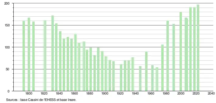 L'évolution du nombre d'habitants est connue à travers les recensements de la population effectués dans la commune depuis 1793. Pour les communes de moins de 10 000 habitants, une enquête de recensement portant sur toute la population est réalisée tous les cinq ans, les populations de référence des années intermédiaires étant quant à elles estimées par interpolation ou extrapolation[16]. Pour la commune, le premier recensement exhaustif entrant dans le cadre du nouveau dispositif a été réalisé en 2007[17].