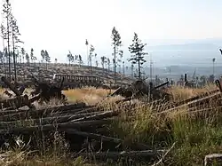 Le , un vent violent venant du nord a soufflé entre 15 h 30 et 18 h. La vitesse la plus élevée fut enregistrée à la limite amont de la forêt à une altitude de 1 480 m à 230 km/h[40]. Cette tempête a laissé à nu une bande large de 2 à 5 km et longue de 40 à 50 km sur le versant sud des Hautes Tatras[41]. La superficie totale de la zone endommagée est de 12 600 ha pour environ 2,5 millions de stères[40]. Les conséquences sont toujours visibles actuellement. Outre le fait que le couvert végétal mettra des années à se reconstituer et que le versant sud des montagnes présente toujours un paysage découvert, une nouvelle menace est apparue sur les arbres ayant résisté à la catastrophe. Bien que le massif se situe dans une zone protégée, les arbres tombés ont été enlevés. Dans certaines zones de forêts inaccessibles en particulier dans la vallée de Tichá dolina, ce travail n'a pas pu être fait. Les insectes xylophages se sont multipliés dans les parties dévastées et laissées en friche avant de se répandre sur les forêts ayant résisté au désastre[42].