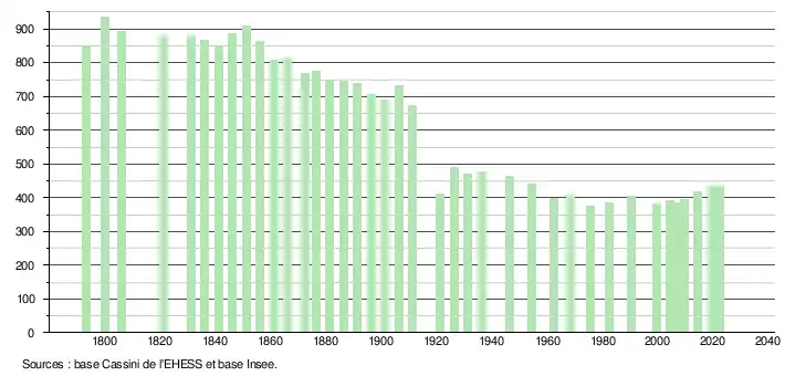 L'évolution du nombre d'habitants est connue à travers les recensements de la population effectués dans la commune depuis 1793. Pour les communes de moins de 10 000 habitants, une enquête de recensement portant sur toute la population est réalisée tous les cinq ans, les populations de référence des années intermédiaires étant quant à elles estimées par interpolation ou extrapolation[39]. Pour la commune, le premier recensement exhaustif entrant dans le cadre du nouveau dispositif a été réalisé en 2004[40].