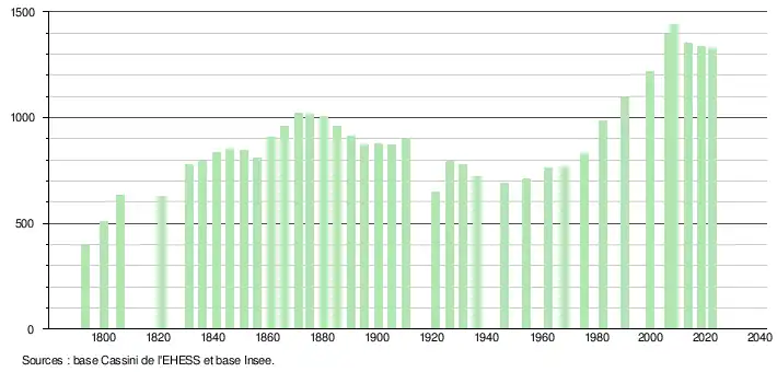 L'évolution du nombre d'habitants est connue à travers les recensements de la population effectués dans la commune depuis 1793. Pour les communes de moins de 10 000 habitants, une enquête de recensement portant sur toute la population est réalisée tous les cinq ans, les populations de référence des années intermédiaires étant quant à elles estimées par interpolation ou extrapolation[24]. Pour la commune, le premier recensement exhaustif entrant dans le cadre du nouveau dispositif a été réalisé en 2008[25].