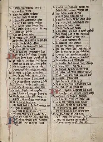 - une version complète copiée entre 1320 et 1330 par un scribe inconnu fait partie du « Recueil de contes de Heidelberg » (Heidelberger Märensammlung) conservé à la bibliothèque de l'université de Heidelberg, identifié par le sigle P ou H ;