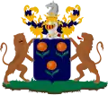 Héraldique napoléonienne : Écartelé : au 1er, d’azur à trois oranges au naturel, tigées et feuillées de sinople ; au 2e, des barons préfets ; au 3e, de sable à trois étoiles à six rais d’or ; au 4e, d’argent à trois trèfles de sinople[2].