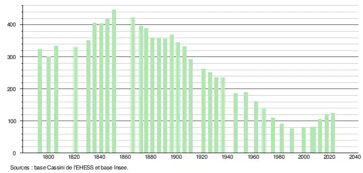L'évolution du nombre d'habitants est connue à travers les recensements de la population effectués dans la commune depuis 1793. Pour les communes de moins de 10 000 habitants, une enquête de recensement portant sur toute la population est réalisée tous les cinq ans, les populations de référence des années intermédiaires étant quant à elles estimées par interpolation ou extrapolation[19]. Pour la commune, le premier recensement exhaustif entrant dans le cadre du nouveau dispositif a été réalisé en 2007[20].