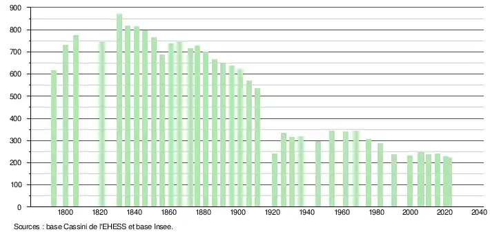 L'évolution du nombre d'habitants est connue à travers les recensements de la population effectués dans la commune depuis 1793. Pour les communes de moins de 10 000 habitants, une enquête de recensement portant sur toute la population est réalisée tous les cinq ans, les populations de référence des années intermédiaires étant quant à elles estimées par interpolation ou extrapolation[21]. Pour la commune, le premier recensement exhaustif entrant dans le cadre du nouveau dispositif a été réalisé en 2005[22].