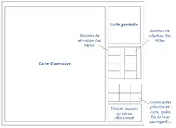 La majeure partie de l’écran d'aventure est occupé par l’écran de jeu principal, représentant la carte du monde, où le joueur peut définir les déplacements de ses héros et obtenir des informations sur les unités ennemies ou les trésors. En haut à droite se trouve la carte de l’ensemble des territoires pouvant être explorés. En dessous, des icônes permettent au joueur de sélectionner un de ses héros ou châteaux. En bas à droite sont affichés le nom du héros sélectionné et la liste des troupes qui l’accompagnent. Enfin, juste au-dessus, six boutons permettent d’accéder aux principales fonctionnalités du jeu : la carte, le livre des quêtes, l’écran de sauvegarde et le passage au tour suivant[7]. Un écran de statistiques liste des renseignements sur les possessions, les ressources et l’état des finances du joueur. En construisant une guilde des voleurs, il peut également obtenir des informations du même type sur ses adversaires[7].
