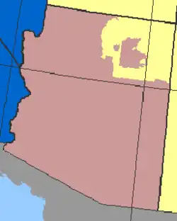 - La Nation navajo observe l'heure d'été sur l'ensemble de son territoire, y compris la partie qui se trouve en Arizona[8]. Cependant, la Nation hopi, qui est entièrement entourée par la Nation navajo et est entièrement dans l'Arizona, n'observe pas l'heure d'été (voir la carte dans l'encart de droite)[9].