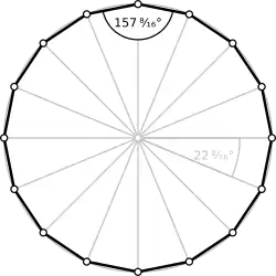 Chaque angle interne de l'hexadécagone régulier mesure et chaque angle au centre, .