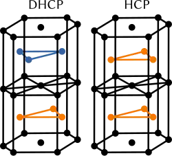 - AB AB AB AB correspond à une structure hexagonale compacte (HC, ou HCP en anglais), observée à l'état standard de deux métaux alcalino-terreux (Be et Mg), six lanthanides (Gd, Tb, Dy, Ho, Er et Tm), seize métaux de transition (Sc, Ti, Co, Y, Zr, Tc, Ru, Lu, Hf, Re, Os, Lr, Rf, Bh, Hs et Cn), trois métaux pauvres (Zn, Cd et Tl) et peut-être de Nh[4], ou encore à moins de 1 K sous au moins 2,5 MPa dans l'hélium solide α[5] ;