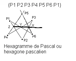 Un hexagramme de Pascal est un hexagone irrégulier très particulier. Il est tel que les côtés opposés se coupent en trois points alignés. Cette configuration, inventée par Blaise Pascal, est très utile pour l'étude des ellipses, hyperboles, paraboles, cercles.