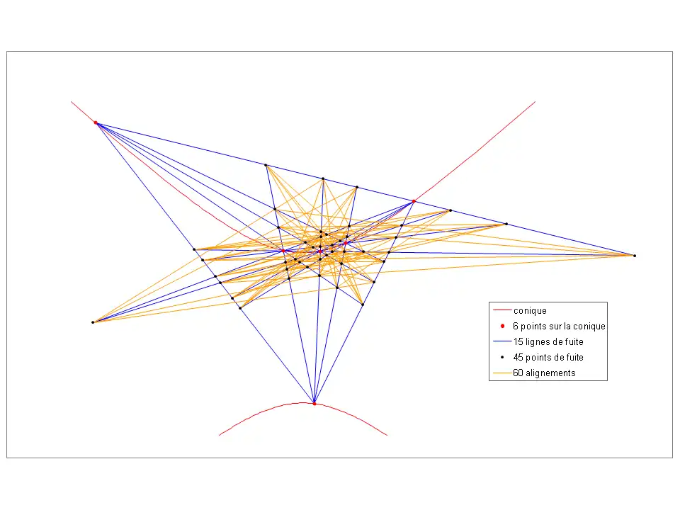 Etant donné que le théorème est valable pour un hexagone quelconque inscrit dans une conique, on obtient un alignement pour chacune des 60 permutations des sommets de l'hexagone. La figure ci-dessous montre les 60 alignements produits par ce théorème à partir de 6 points sur une hyperbole.