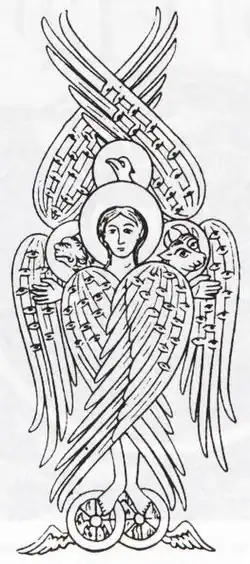 Les yeux correspondant ici à la science, les roues à la mobilité de leur esprit, qui peut examiner chaque aspect de la nature des choses. Les quatre faces ont plus tard été adoptées comme symbole des quatre évangélistes, le Tétramorphe, suivant la vision donnée dans le livre de l'Apocalypse : « Au milieu du trône et autour du trône, il y a quatre êtres vivants remplis d’yeux devant et derrière. Le premier être vivant est semblable à un lion, le second être vivant est semblable à un veau, le troisième être vivant a la face d’un homme, et le quatrième être vivant est semblable à un aigle qui vole. »[24]