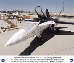 Le F-18 HARV, photographié en vol lors d'une manœuvre à fort angle d'incidence près de la base d'Edwards, en . | |