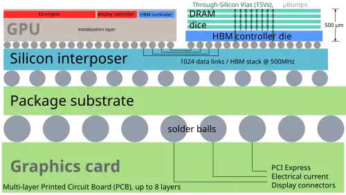 Le plus grand nombre de connexions à la mémoire, par rapport à la DDR4 ou GDDR5, nécessitait une nouvelle méthode de connexion de la mémoire HBM au GPU (ou à un autre processeur)[14]. AMD et Nvidia ont tous deux utilisé des puces de silicium spécialement conçues, appelées interposeurs (en), pour connecter la mémoire et le GPU. Cet interposeur a l’avantage supplémentaire de nécessiter que la mémoire et le processeur soient physiquement proches, ce qui réduit les chemins de mémoire. Cependant, comme la fabrication de dispositifs semi-conducteurs est nettement plus chère que la fabrication de circuits imprimés, cela ajoute un coût au produit final.